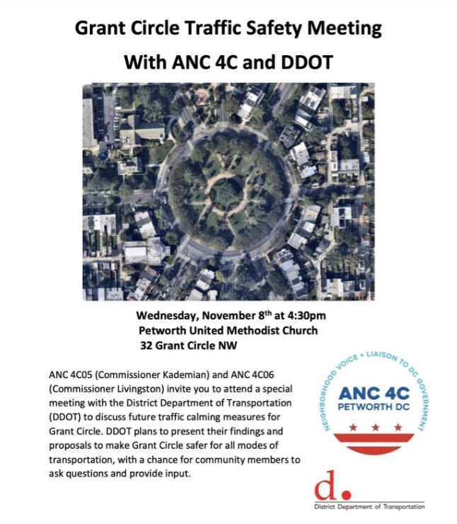 For those looking for a preview of how DDOT is thinking about traffic safety in Petworth’s circles, ANC 4C is hosting a meeting with DDOT about traffic safety at Grant Circle this coming Wednesday afternoon. I plan to be there to listen in (and maybe see if we can get DDOT inspired about similar work a few blocks north!), and any others who might be interested are welcome as well!